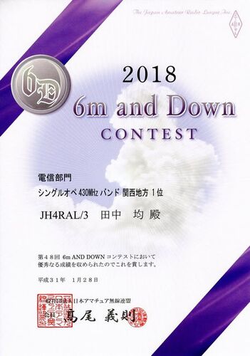 6m AND DOWNコンテストの賞状が到着。 大雨で参加が危ぶまれた当日の様子は【こちら】 各局ありがとうございました。